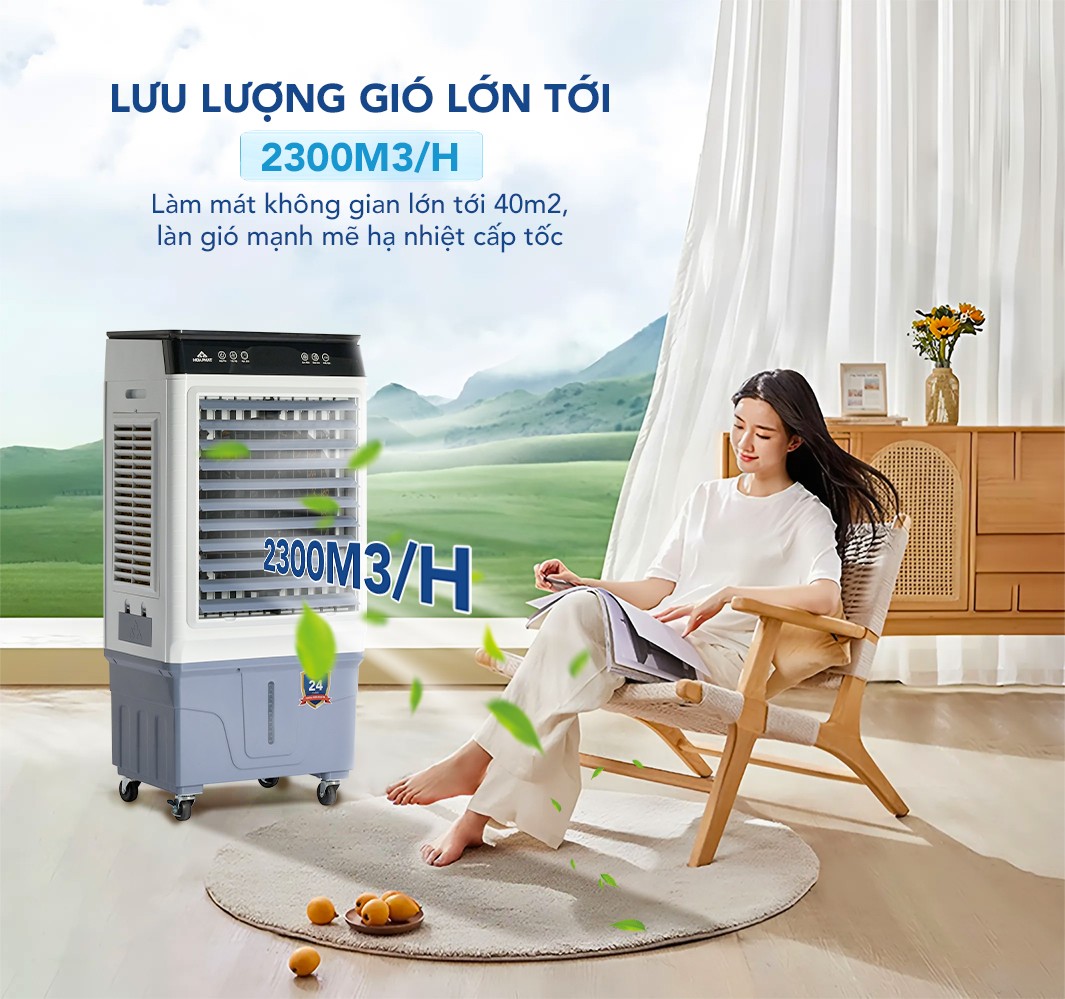 Lưu lượng gió lớn tới 2300m3/h, kết hợp với dung tích bình nước lớn và 3 cấp làm mát cho làn gió mạnh mẽ thôi bay cơn nóng. Làn gió từ máy làm mát không khí luôn đi kèm hơi nước nên luôn giữ độ ẩm và dịu mát, nhanh chóng hạ nhiệt không khí.